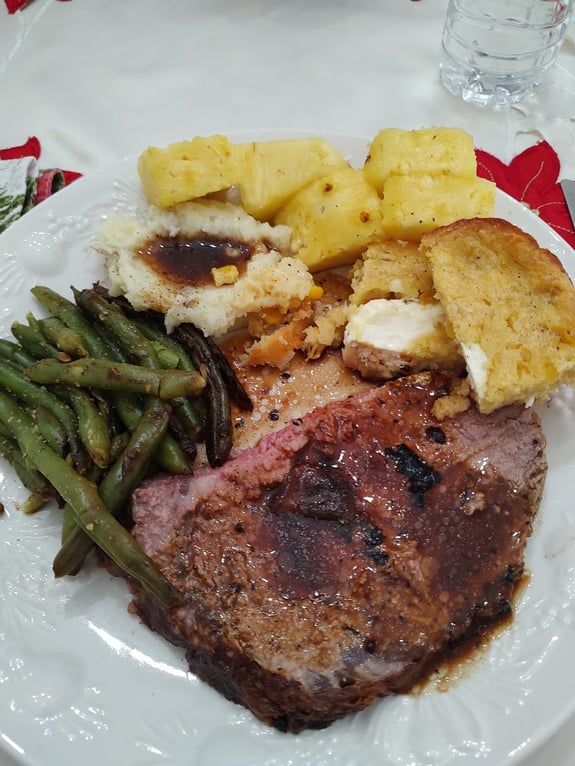 The photo? Christmas dinner, reasonably unrelated, but relative in that I am grateful for what is in front of me, not by what is trying to distract me. Dinner at my Mom’s: roast beef and gravy, mashed potatoes with skins, cornbread with cream cheese, green beans, cubed pineapple, and not featured, compliments of [Family friends], homemade key-lime pie with roasted coconut slivers.
